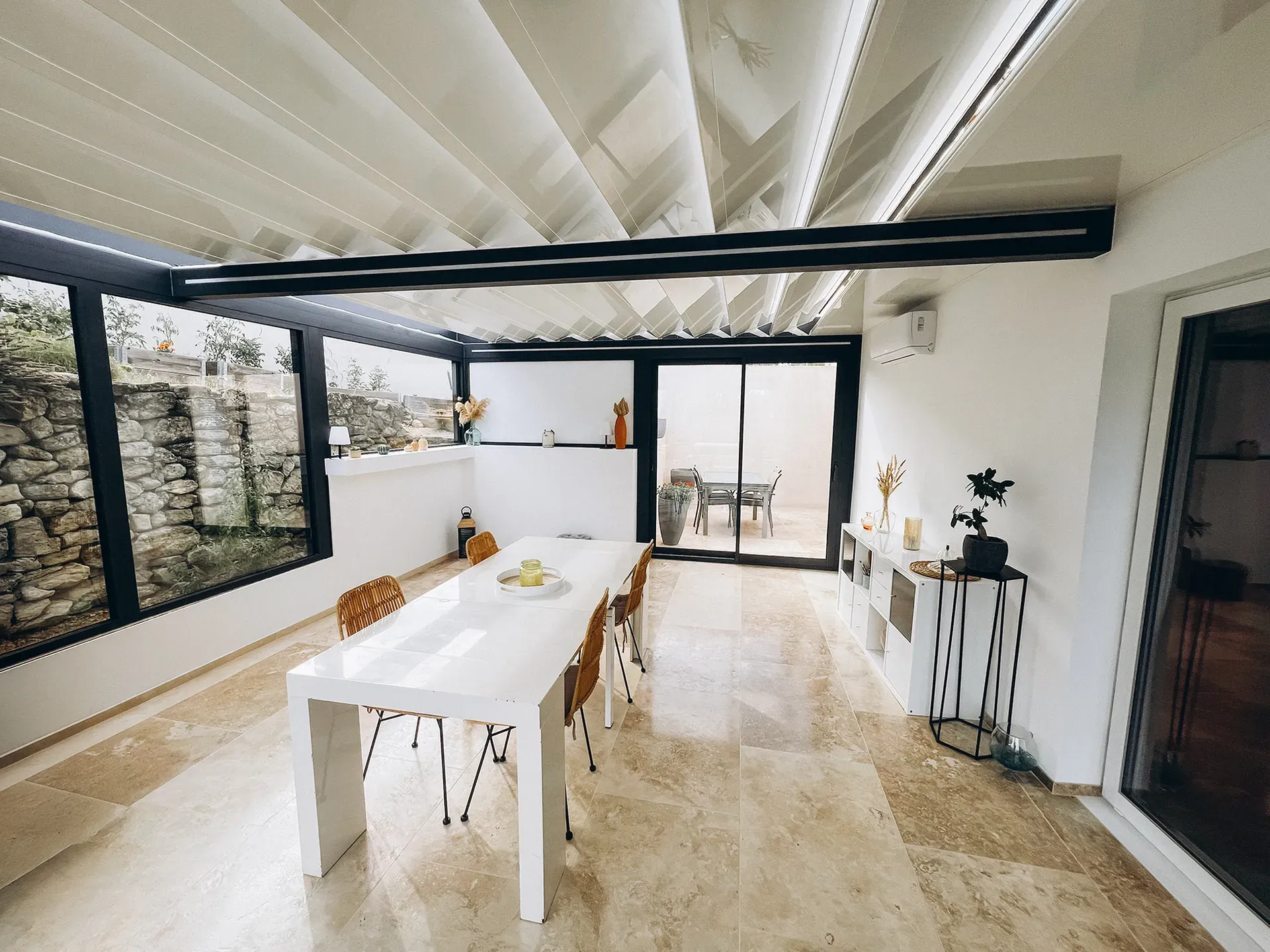 Cette extension toit rétractable peut accueillir de nombreux usages : salon lumineux, salle à manger ouverte, espace détente ou pièce de réception. Elle peut être complétée par des fermetures latérales, des éclairages intégrés ou des options de personnalisation pour s’intégrer harmonieusement à l’architecture locale.