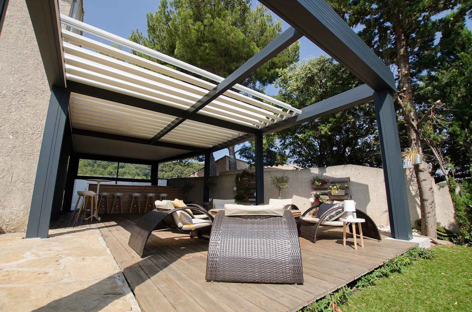 Pergola toit rétractable isolé Ciel Ouv’air® dans le Sud-Ouest pour profiter de terrasse modulable confortable toute l’année